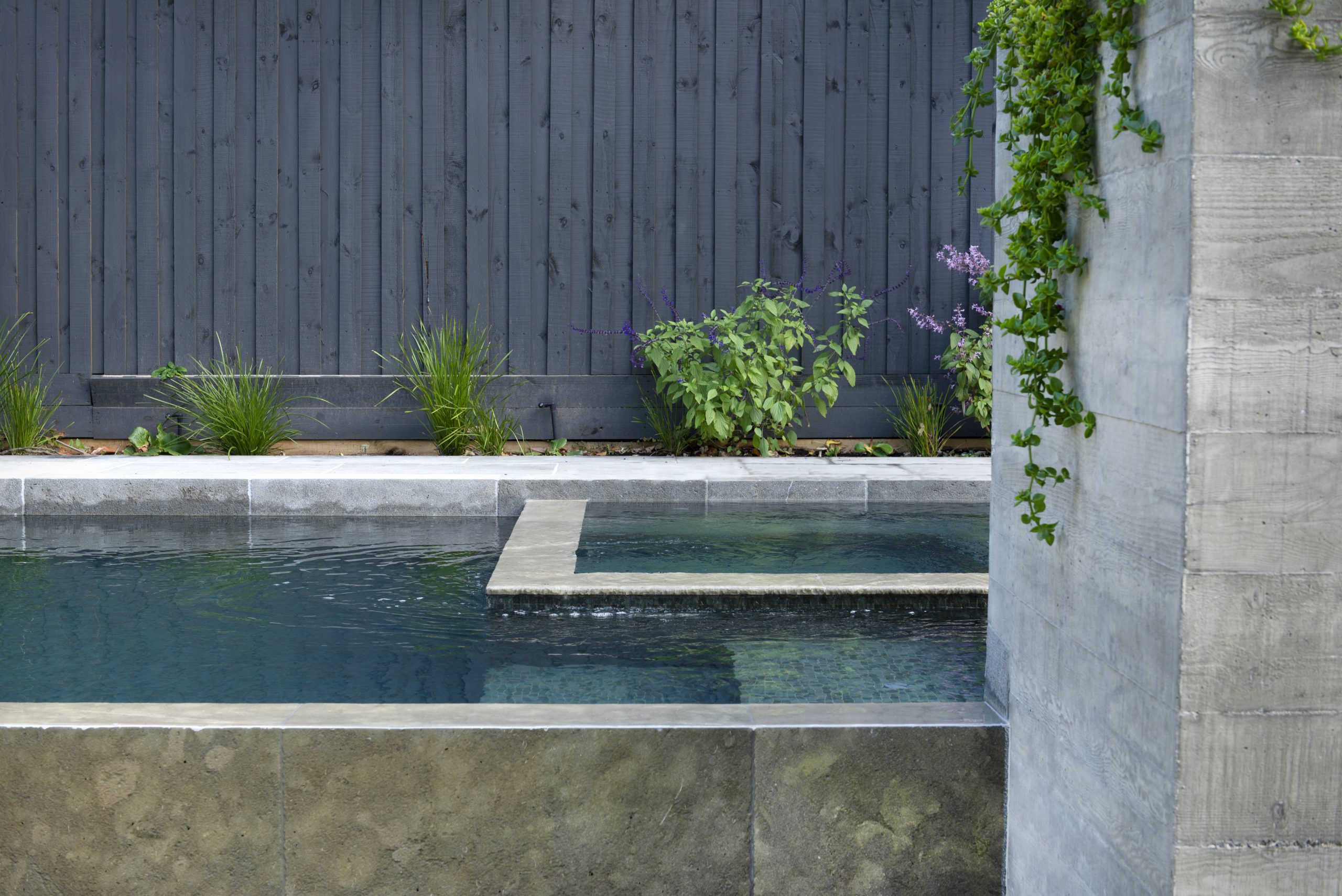 This Falcon Pool was designed to be a focal point of the rear garden and was built immediately after the demolition works were completed as the full width basement would make site access impossible. The negative edge provides a year-round water feature to be viewed from the full height windows to the ground floor living areas of the home that look out onto the pool. In addition to the coping, the paving materials have been incorporated into the negative edge. The grey-green Bisazza glass mosaic pool tiles are consistent with the subdued natural tones of the garden and the home. The pool is fully automated and is controlled via smartphone application (Connect10) as well as being remotely monitored.